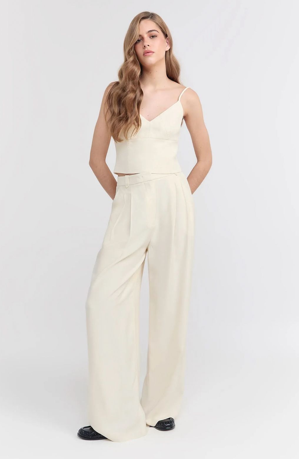 Calça confeccionada em alfaiataria, com modelagem pantalona e comprimento longo. A peça possui cintura média, pregas frontais e bolsos funcionais, incluindo costas, vivos e faca. Finalizada com fechamento por gancho e zíper, além de barra invisível, garante sofisticação e caimento impecável