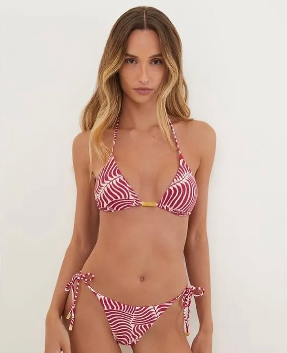 A lycra na estampa Ginga é feita com fio reciclado pré-consumo, uma base mais responsável, da linha CARE. A modelagem Tri tem o top de biquini vermelho estampado em shape triângulo ajustável com amarração nas costas e no pescoço. - Cobertura pequena - Baixa sustentação - Bojo removível - Detalhes feitos à mão no ateliê ViX Combine com uma saída de praia e acessórios ViX, como chapéu, bolsa e sandália flat. A lycra na estampa Ginga é feita com fio reciclado pré-consumo, uma base mais responsável, da linha CARE. A calcinha de biquíni vermelha estampada tem a modelagem Brasil. Pode ser usada mais alta ou mais baixa. - Cobertura pequena - Ponteiras de metal