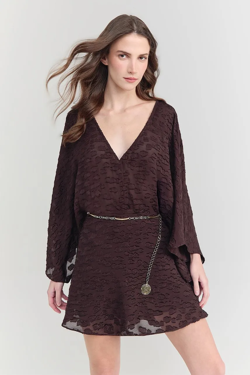 Confeccionado em jacquard fluido, o vestido apresenta modelagem acinturada e comprimento curto. Com textura marcante e mangas amplas estilo kimono, possui decote V e fechamento posterior com zíper invisível. A barra em formato lenço e a capa nas costas conferem movimento e elegância à peça.